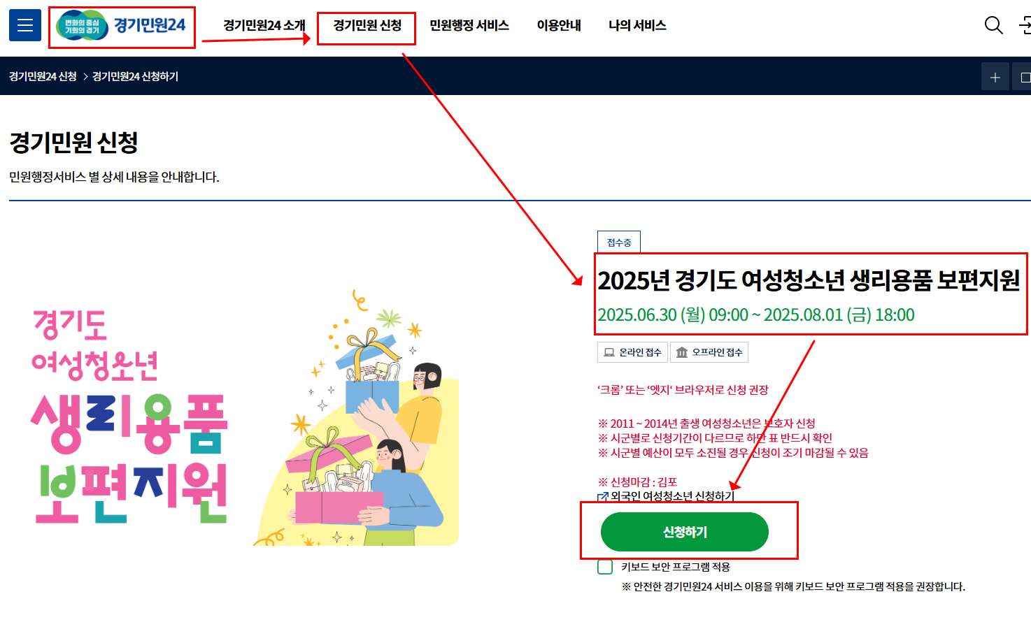 2007년 1월 1일 ~ 2014년 12월 31일 출생자 사이에 출생한 여성청소년 중, 경기도 24개 시군에 거주하거나 체류하는 경우에 신청할 수 있어요.