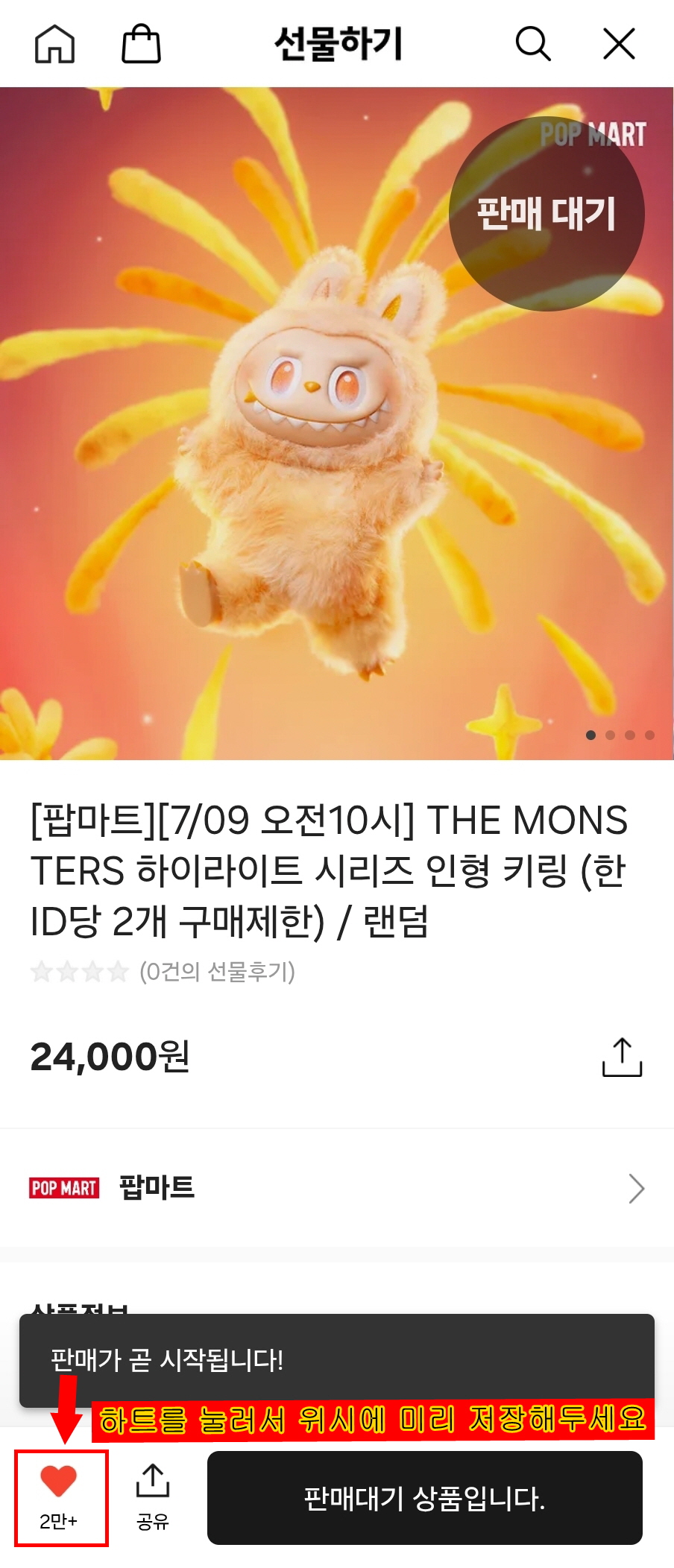 제품 링크 들어가서 왼쪽 아래 하트를 누르시고 미리 위시에 저장해주세요. 오픈 5~10분 전부터 대기 한 후 위시 목록에서 라부부 선택 → 제품 구매하기 바로 눌러주세요. 와이파이 환경 등 빠른 네트워크도 중요합니다.
