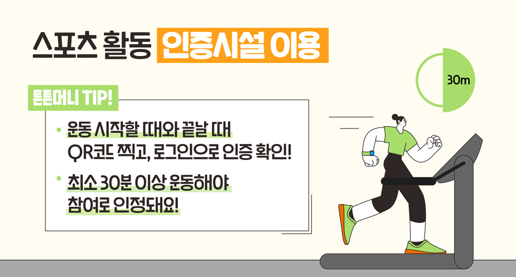 | 스포츠 활동 전후 QR 인증 | 1,000P | 하루에 1번, 주 3회, 연 50회 |