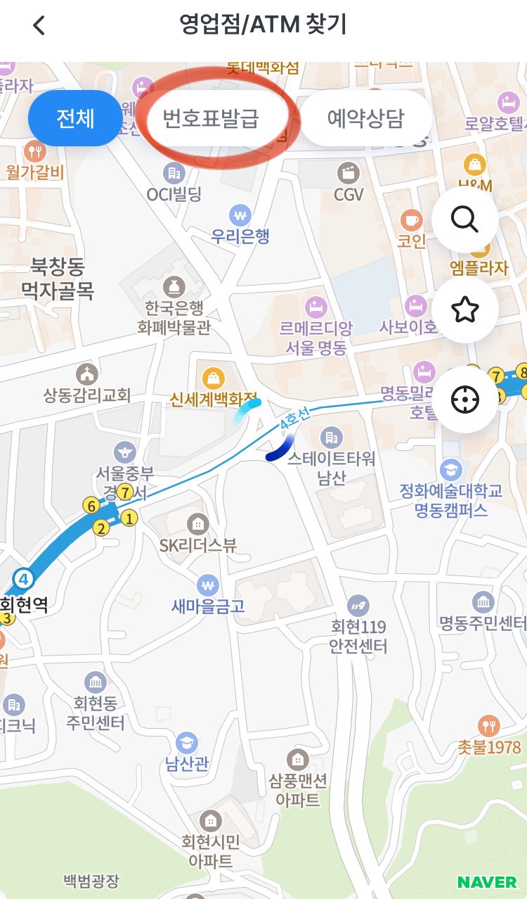 | 국민은행, 신한은행, 우리은행, 하나은행 | 앱의 [전체 메뉴] → [지점/영업점 찾기] → 번호표 발급 |