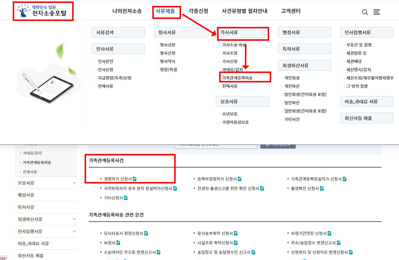 2️⃣ 서류 제출 경로 선택 : 서류제출 → 가사서류 → 가족관계등록비송 → 개명허가신청서 클릭