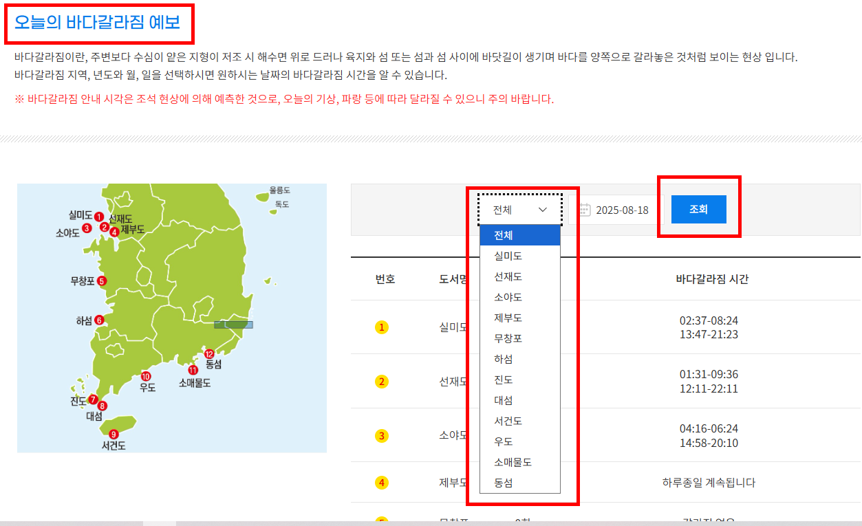 ✅ 국립해양조사원 홈페이지 → 해양정보 → 해양생활 → 바다갈라짐