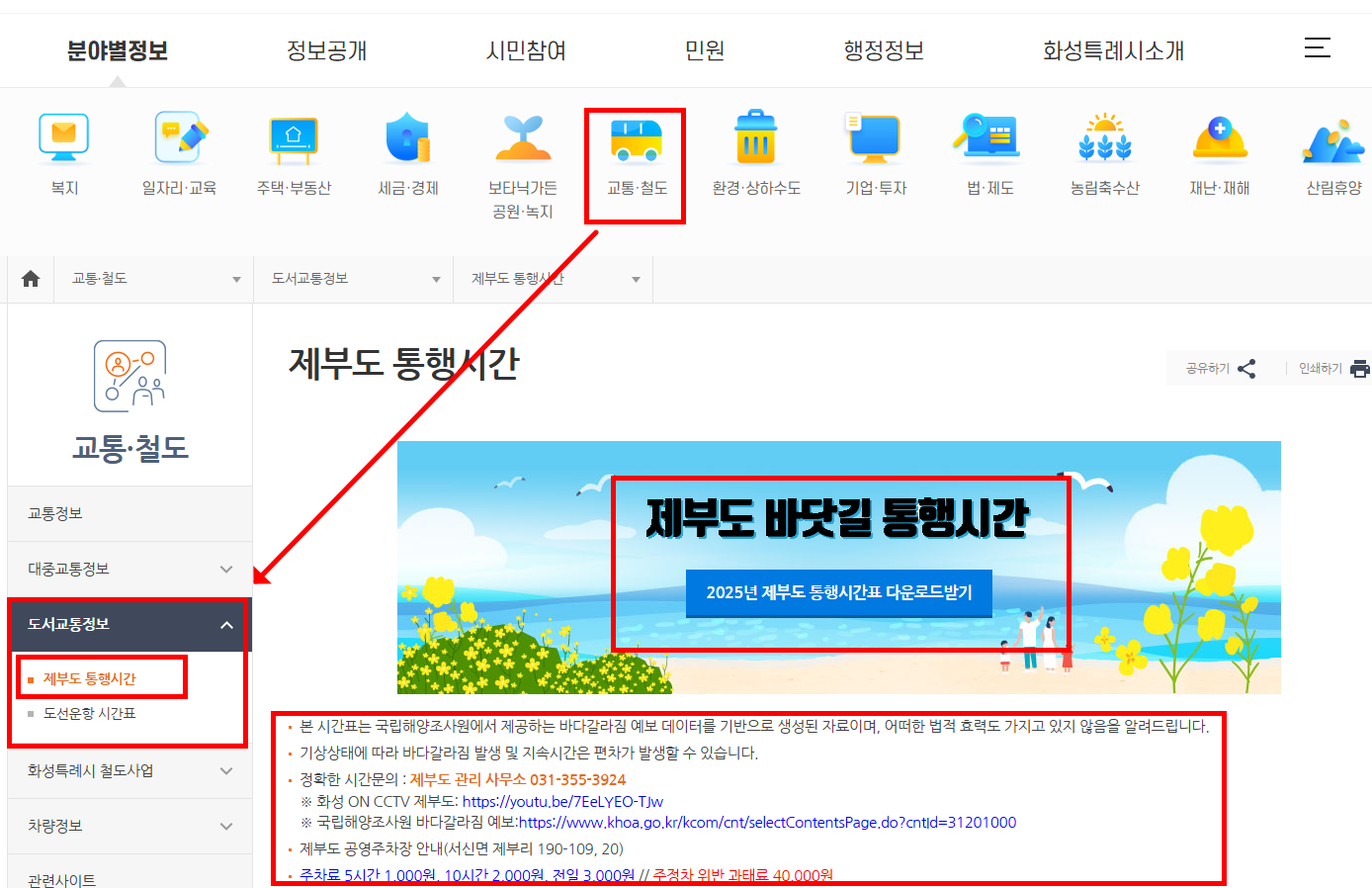 ✅ 화성시청 홈페이지 → 교통철도 → 도서교통정보 → 제부도 통행시간