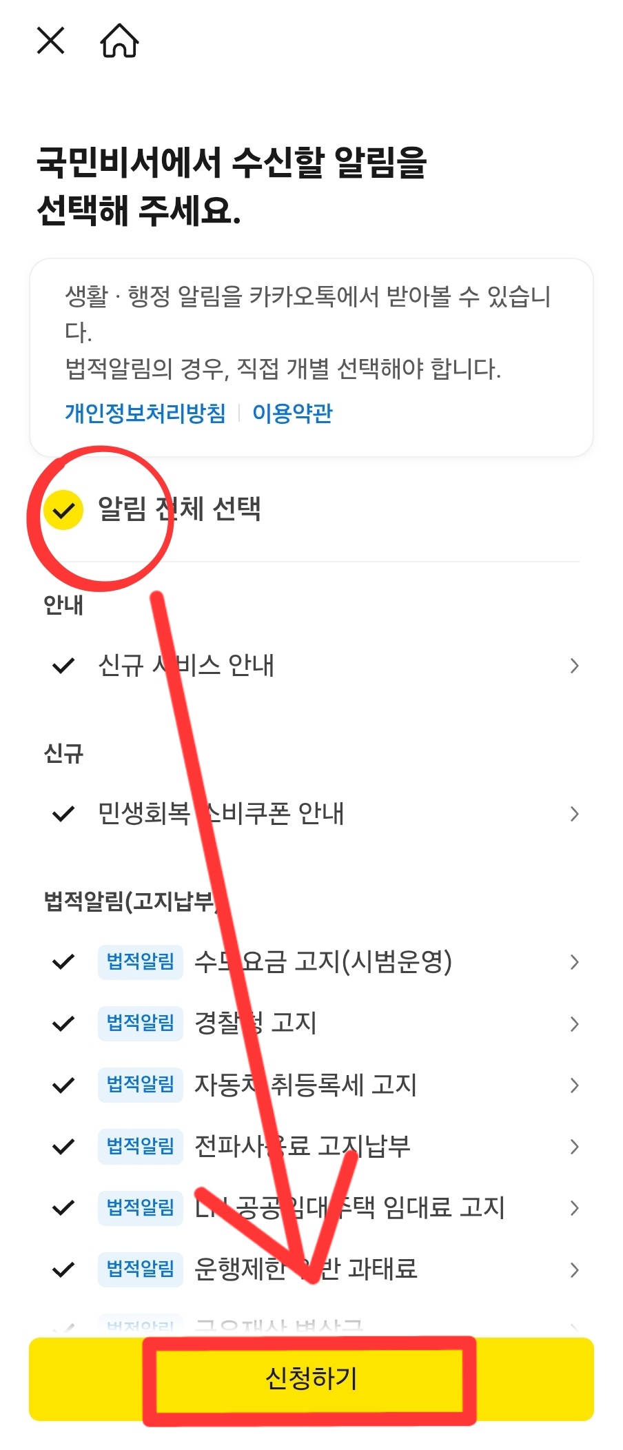 카카오톡 앱의 하단 가장 오른쪽 [더보기] → [지갑] → [전자문서] → [국민비서 생활정보 알림받기] 에서 신청 가능합니다.