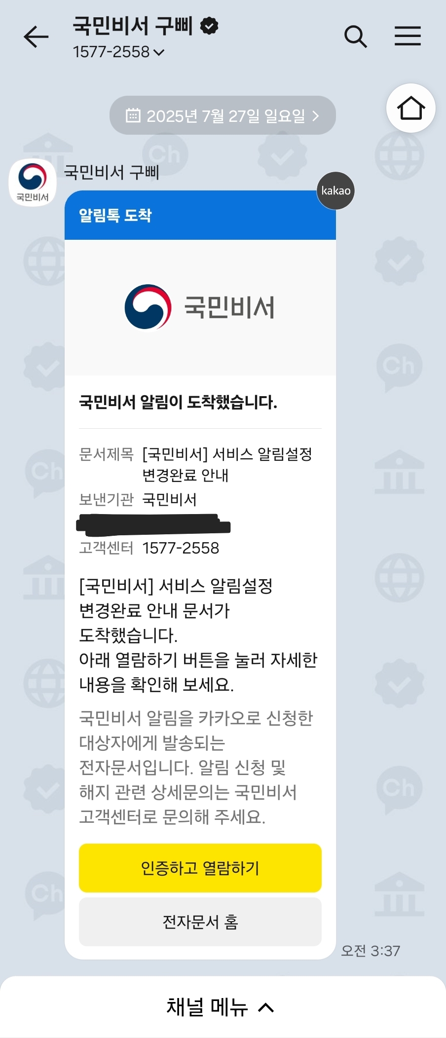 카카오톡앱의 고객센터나 국민비서 콜센터(1577-2558)로 문의하면 해결할 수 있어요.