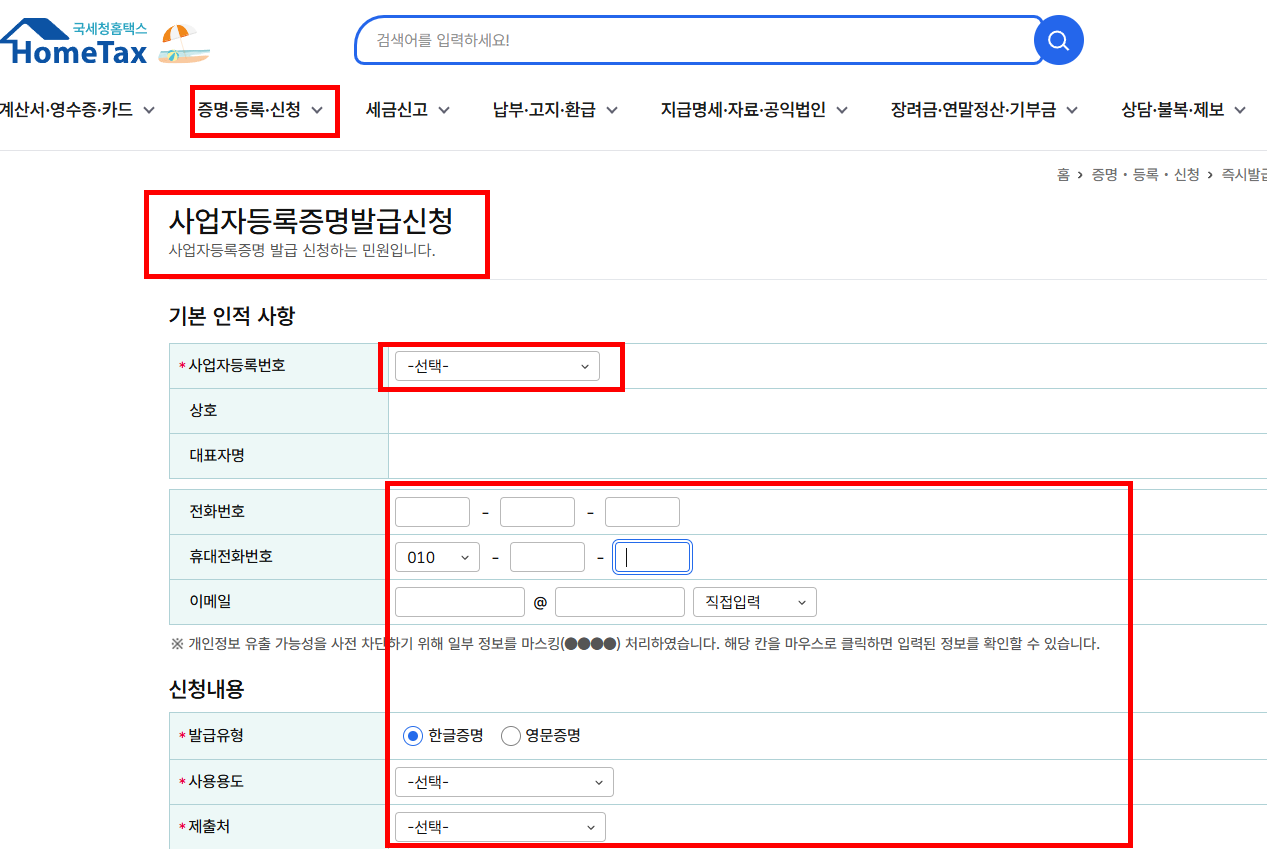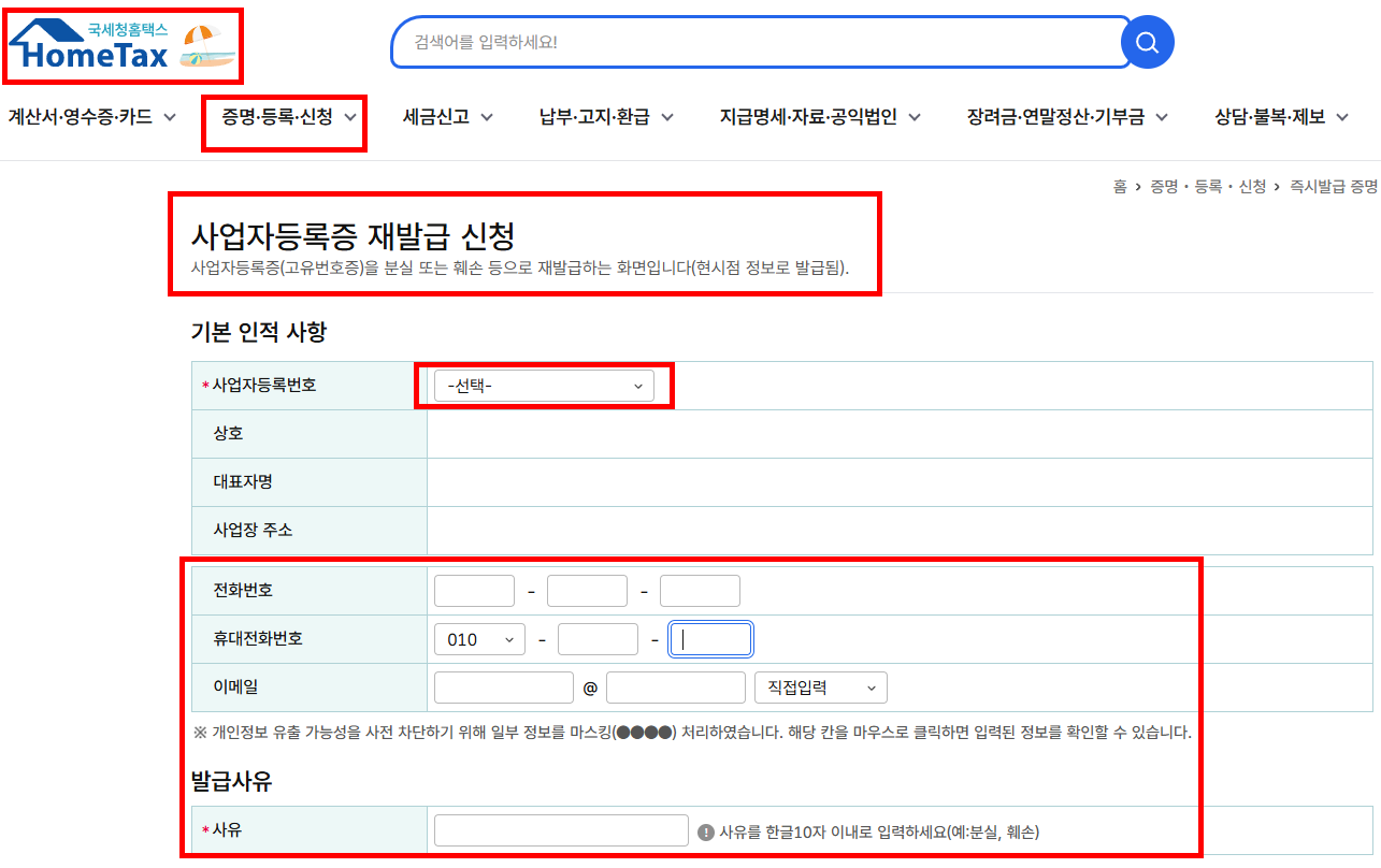 만약 분실하거나 훼손되었다면, 홈택스에서 ‘사업자등록증명’을 출력해 즉시 대체할 수도 있습니다. 그 후에는 재발급은 편리하게 온라인으로 바로 발급이 가능합니다.