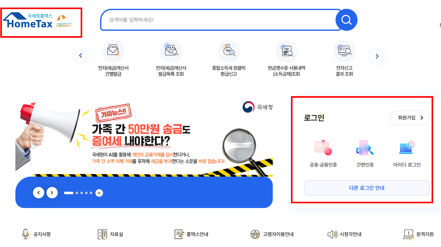 1️⃣ 홈택스(http://www.hometax.go.kr)에 접속 후 공동인증서 또는 간편인증으로 로그인