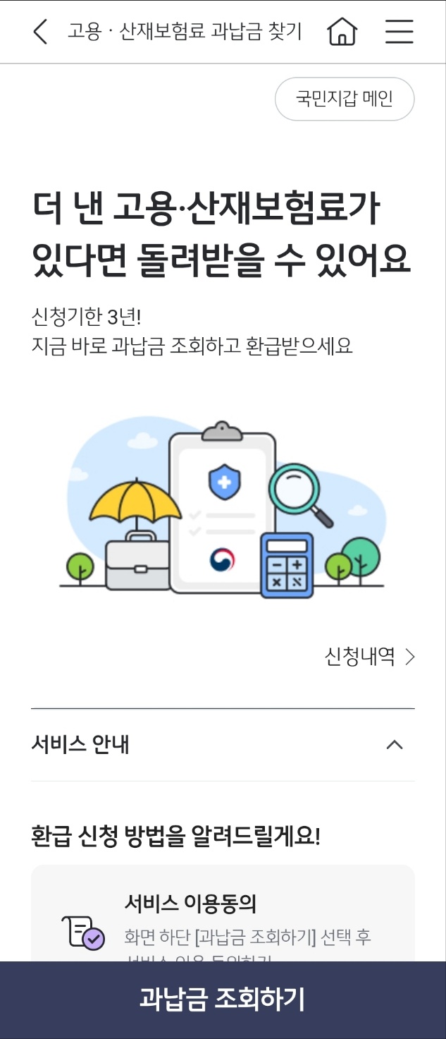 | 국민은행 앱 | 앱 로그인 → 생활/제휴 메뉴 → 국민지갑 → 고용·산재보험료 과납금 찾기 |