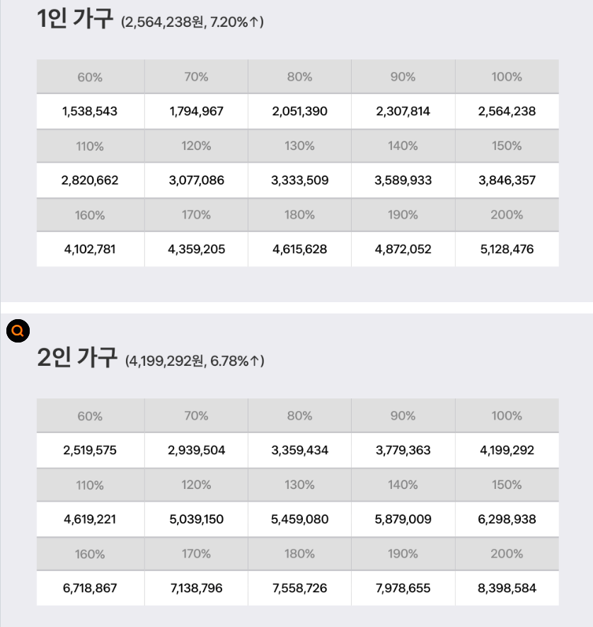 1️⃣ 본인 가구원 수에 맞는 중위소득 기준 확인